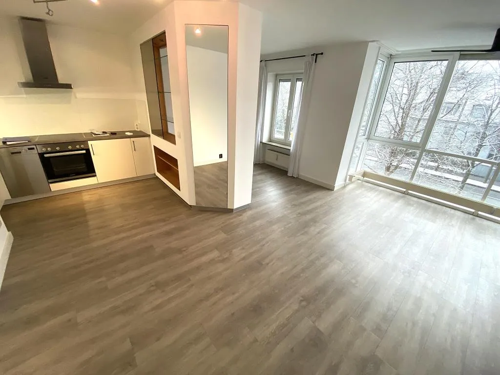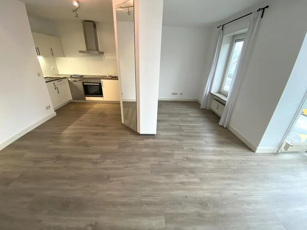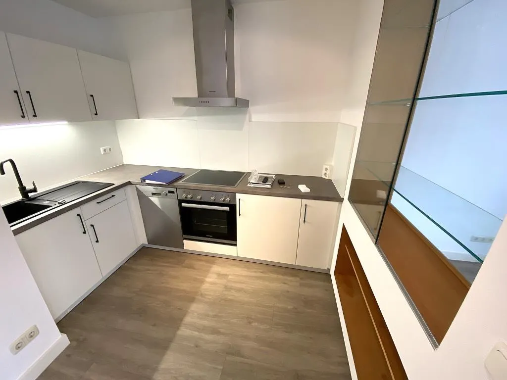 Sehr zweckmäßig und elegant ist der nachträglich installierte Raumteiler zur Abgrenzung von Wohn-/Schlaf- und Küchenbereich. Die stilvolle Einbauküche wurde vor etwa 6 Jahren erneuert und vor 2 Jahren ist im Wohn-/Schlafbereich ein neuer Vinylboden in ansprechender Holzdielenoptik verlegt worden.