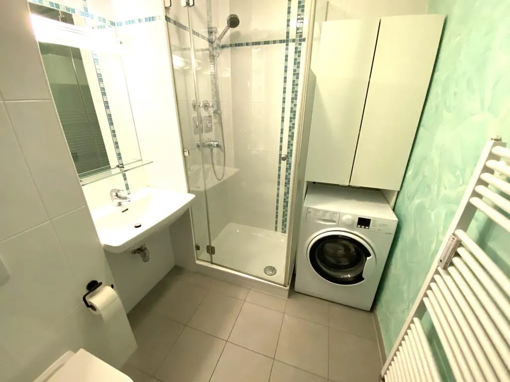 - modernes Bad mit Dusche, Handtuch-Heizkörper, WM-